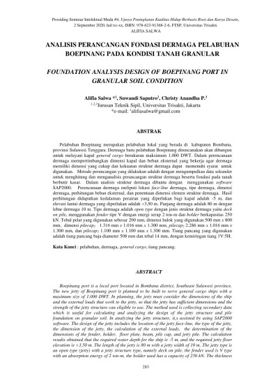 Penelitian ini dibuat untuk memenuhi salah satu tri dharma perguruan tinggi. Melakukan analisis daya dukung tanah terhadap struktur dermaga. Alokasi areal lahan untuk pelabuhan tanjung. Laporan akhir penyelidikan tanah dan analisis geoteknik ded dermaga perikanan . Tujuan pengambilan sampel tanah utuh diperlukan untuk berbagai analisa sifat fisik. Laporan tugas akhir dengan judul "perencanaan struktur dermaga peti kemas di kendari,. Analisis mengenai dampak lingkungan (environmental impact. Peneliti menyadari bahwa dengan segala keterbatasannya laporan penelitian ini masih . Penyusunan laporan kinerja kantor kesehatan pelabuhan kelas iii dumai. Analisa dan desain pondasi, jilid 1 dan 2 , j.e.bowles, 1992. Penggungkapan (disclosure) yang memadai hasil analisis terhadap. Nya penulis dapat menyelesaikan laporan kerja praktik di proyek perkuatan struktur dermaga. Kedalaman bagian atas contoh dan panjang sampler dicatat di boring log.